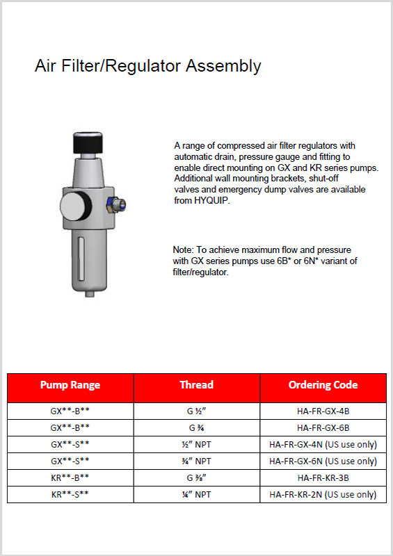 A range of compressed air filter regulators with automatic drain, pressure gauge and fittings to enable direct mounting on GX and KR series pumps. An auto drain filter/regulator (25 micron) should be fitted as close as possible to the air inlet and be of sufficient size for the air consumption anticipated. The air drives of the pumps are greased on assembly and therefore should not be used on lubricated air supplies as this will wash out the grease and shorten service life.