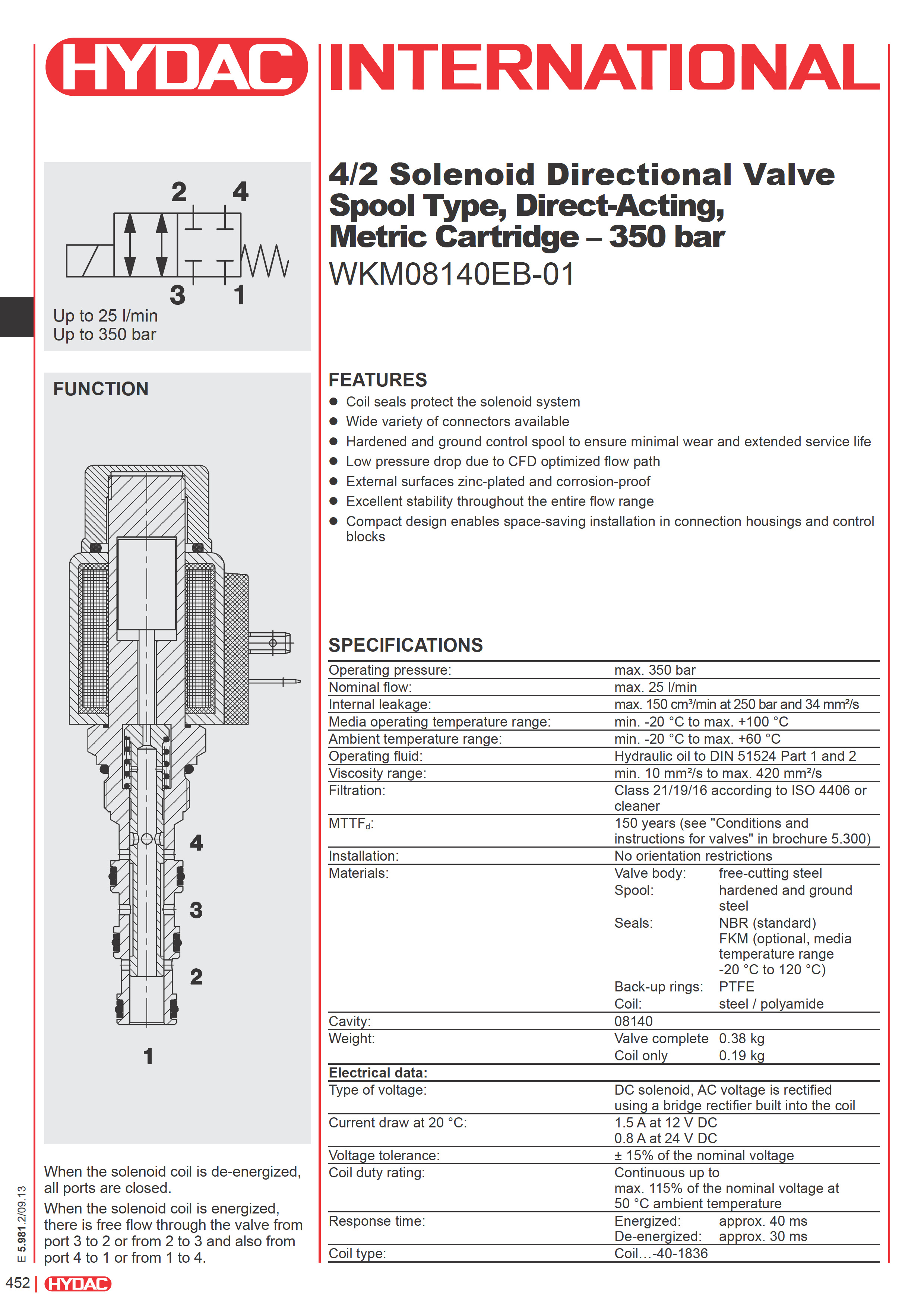 4/2 Solenoid Directional Valve Spool Type, Direct-Acting, Metric Cartridge – 350 bar