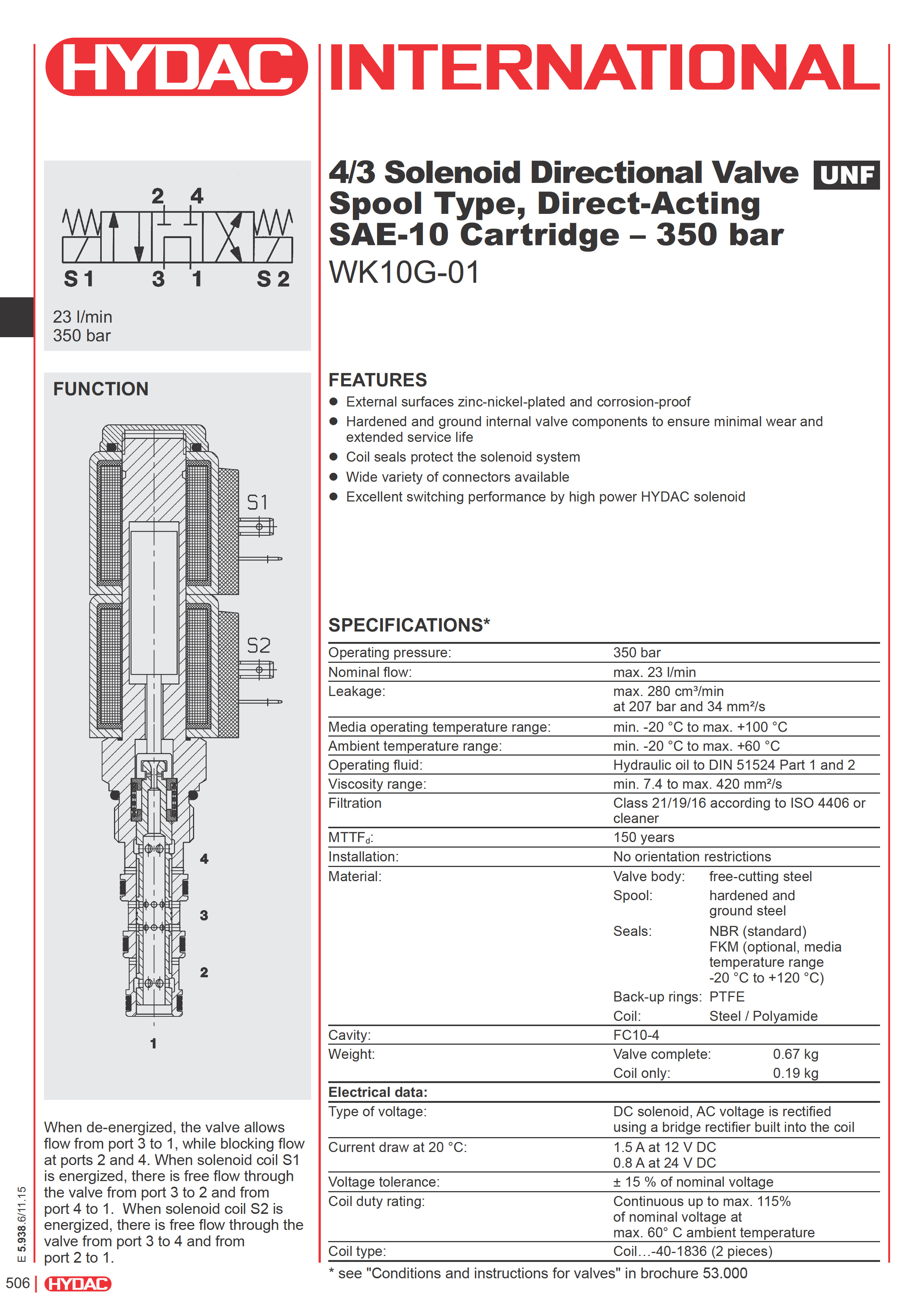 This HYDAC solenoid valve is a robust, high-performance unit designed for pressures up to 350 bar and flows up to 23 l/min. With sealed electronics, corrosion-resistant materials, and no orientation restrictions, it's ideal for demanding hydraulic systems where reliability and flexibility are essential.
