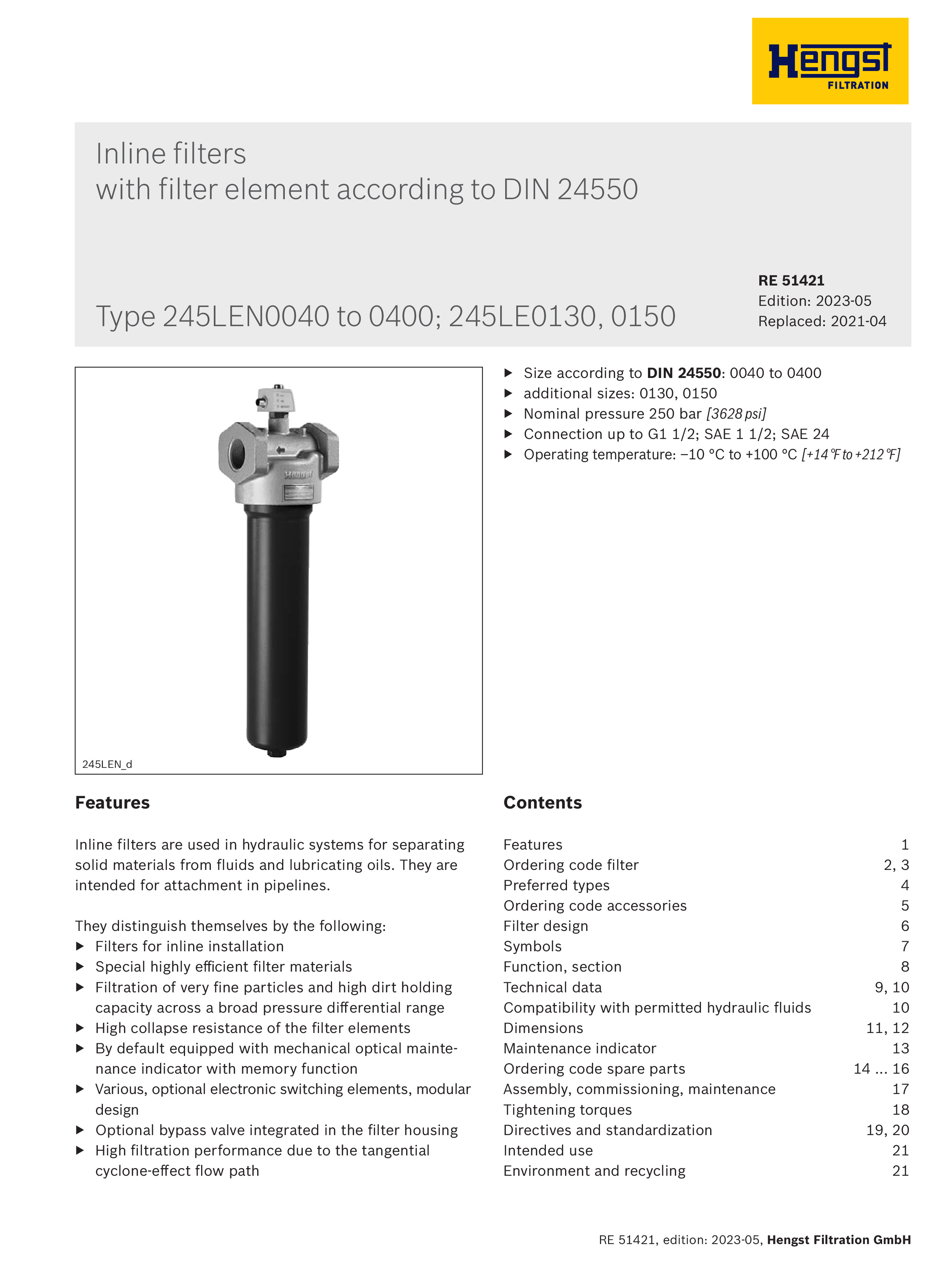 Hengst inline filter with filter element Type 245 LE(N)