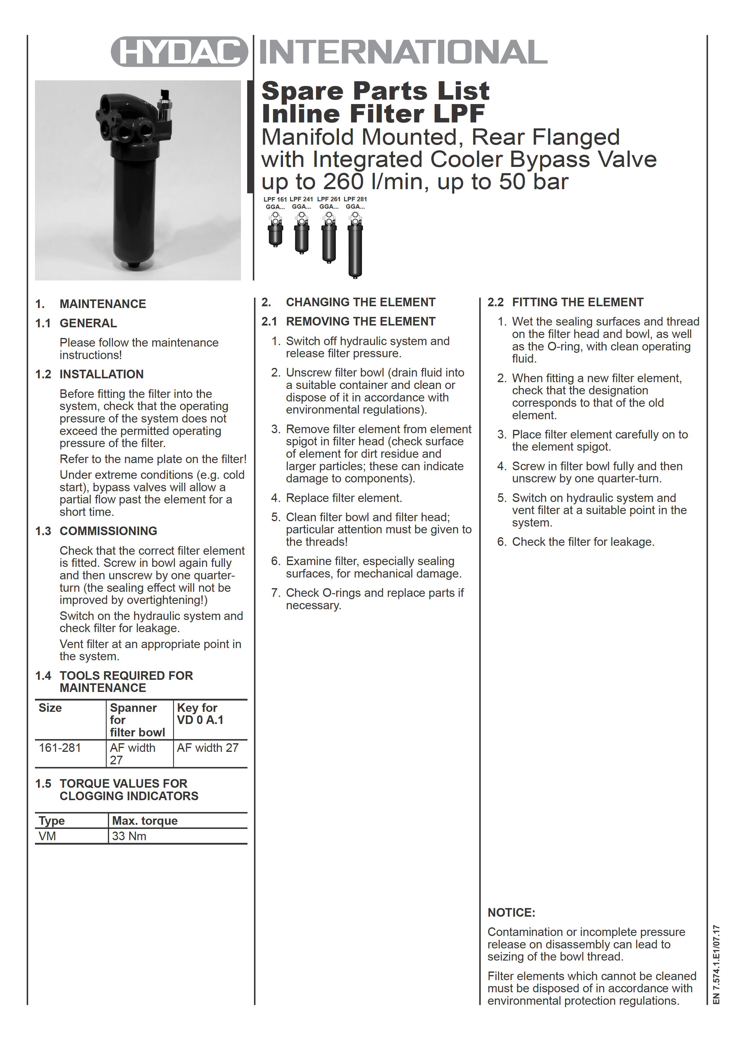 HYDAC Inline Filter with Integrated Cooler Bypass Valve LPF...GGA