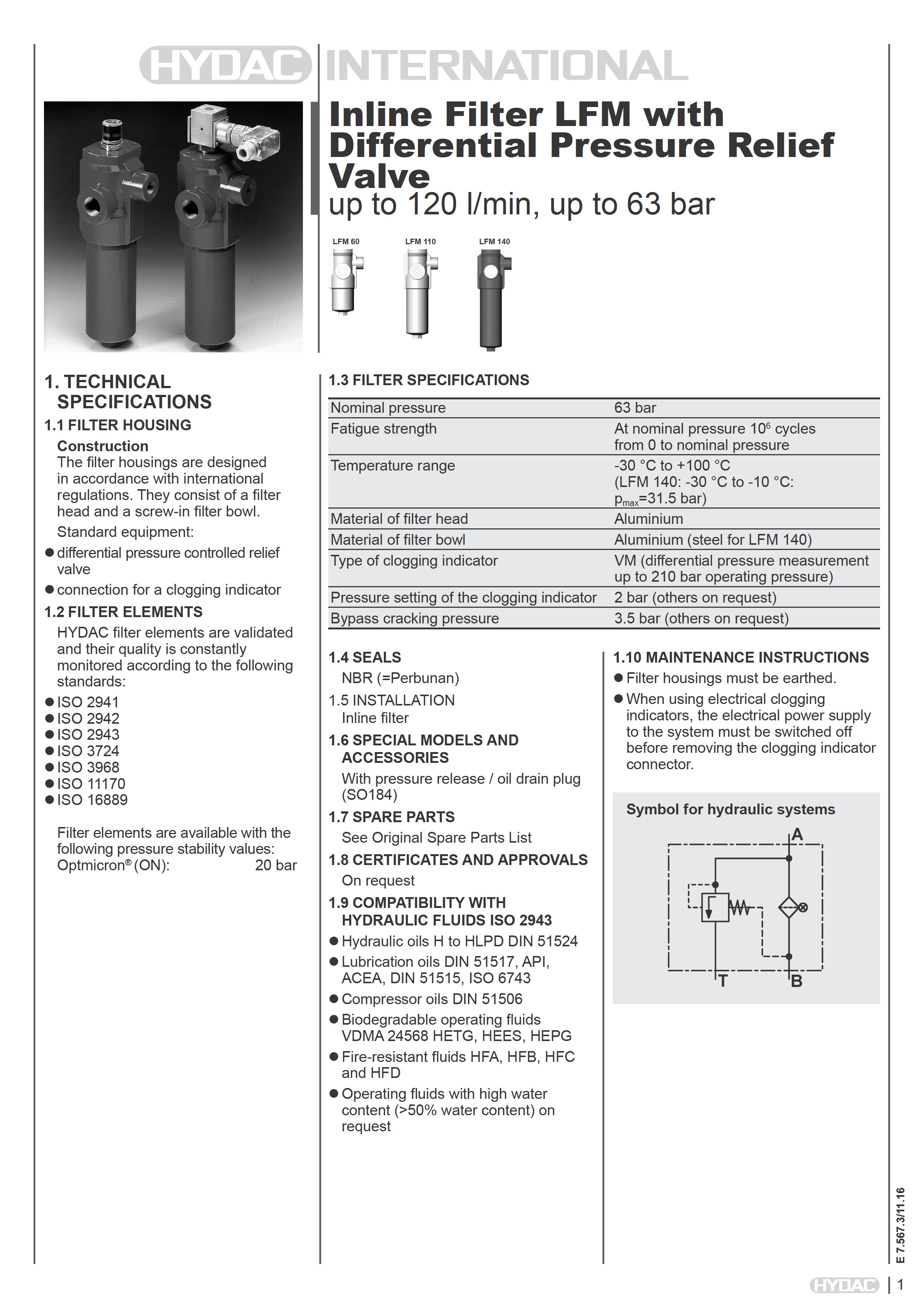 HYDAC LFM Inline Filters with Circulation Valve are compact, high-performance filters for flow rates up to 120 l/min and pressures up to 63 bar. Designed with integrated differential pressure-controlled relief valves, these filters ensure reliable protection of hydraulic systems.