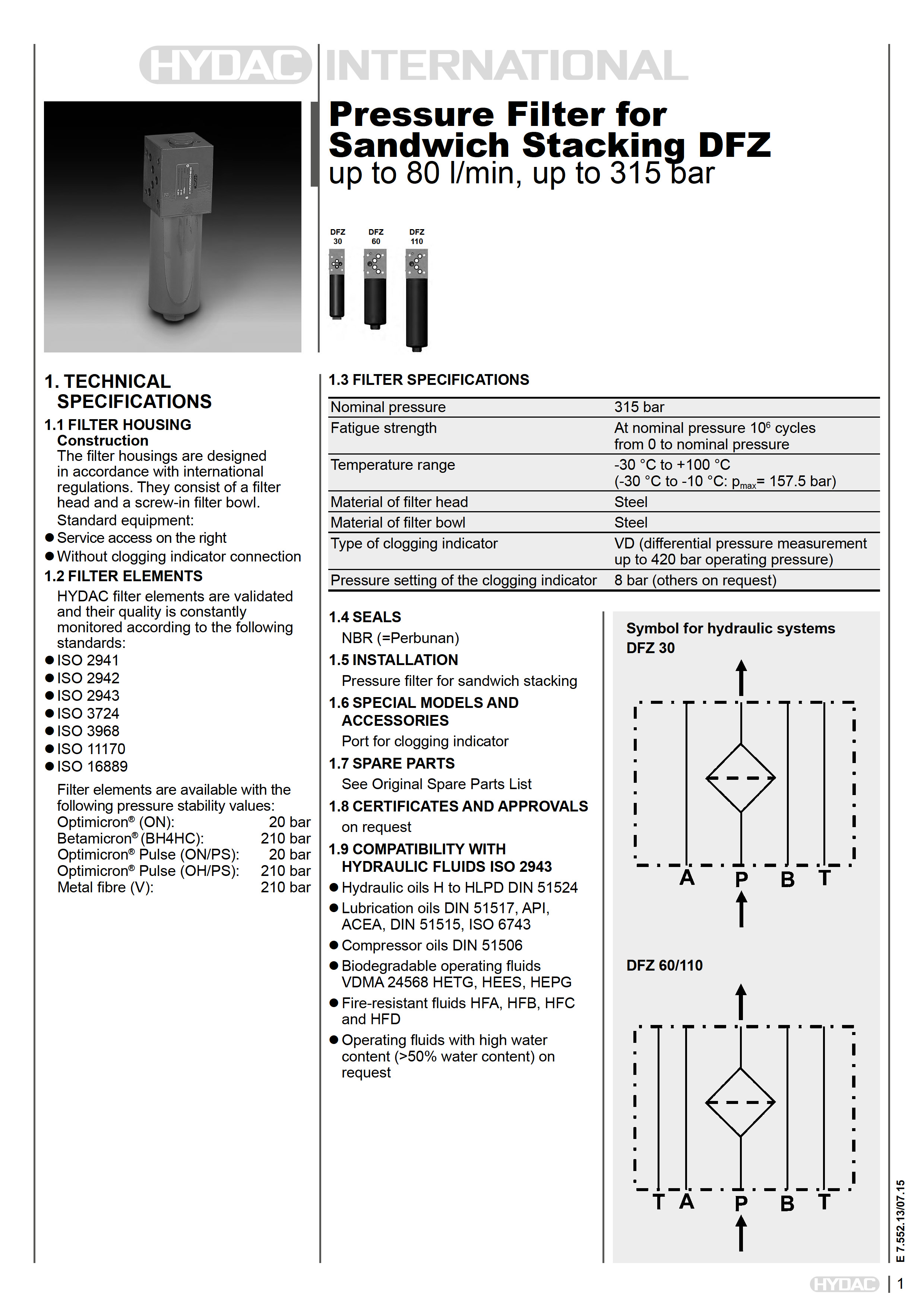 HYDAC Pressure Filter DFZ for Sandwich Stacking